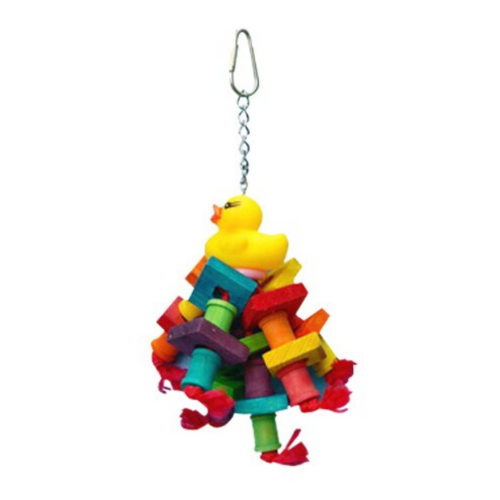 Stacked with colorful wood blocks and finished with a cheerful rubber duck topper, this is a playful toy that combines texture, color, and fun. Great for light chewers and birds who love variety in their cage décor.